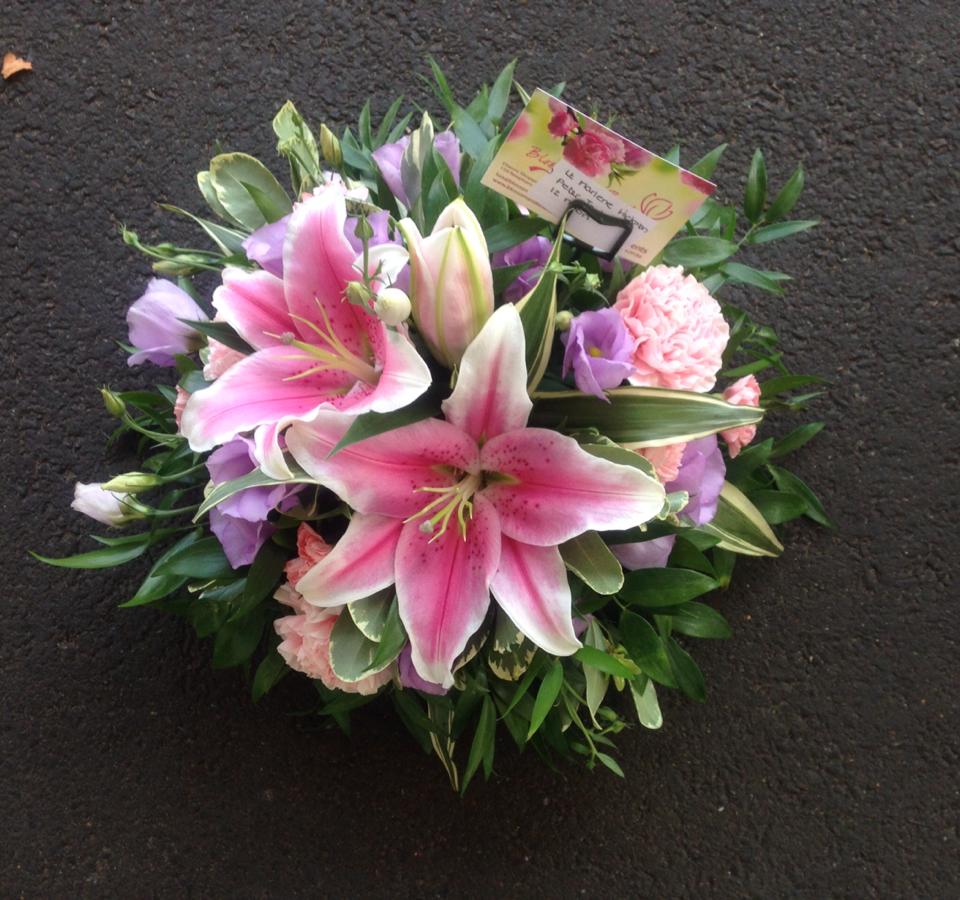 Pink and lilac round posy design, containing pink lilies, lilac eustoma and pink carnations with mixed foliage.