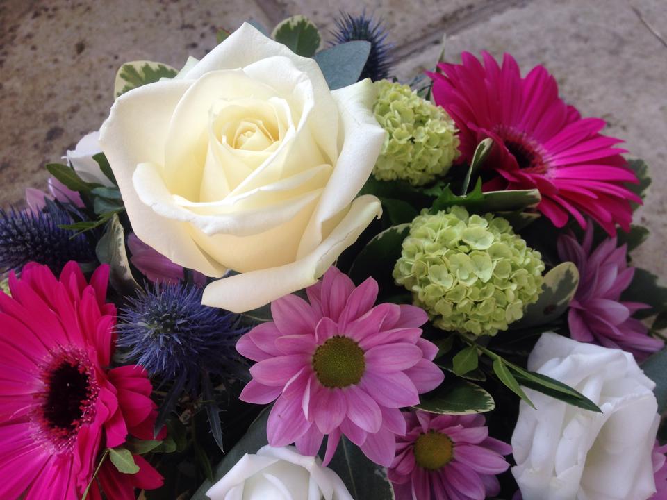 Pink and white round posy design, containing gerberas, roses, chrysanthemums, eustoma and thistle.