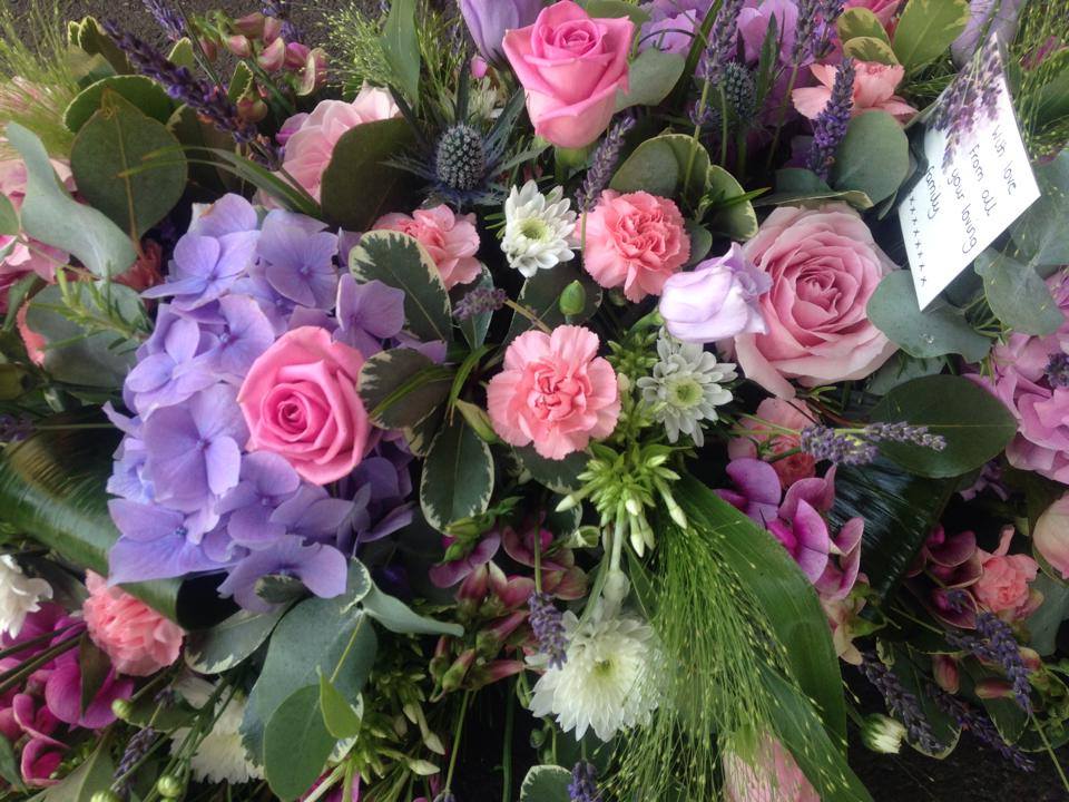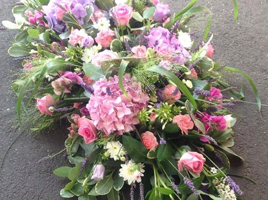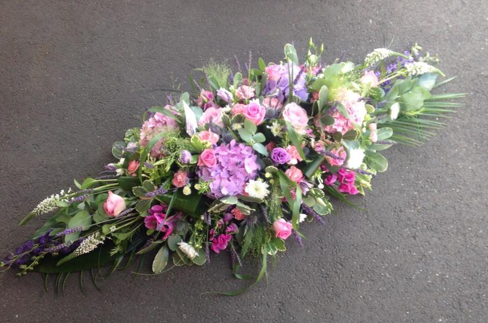 Country style casket spray containing fresh lavender, hydrangea's, roses, sweet peas, eustoma, aconitum and thistle. (3 ft 6'' in length)