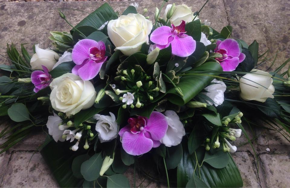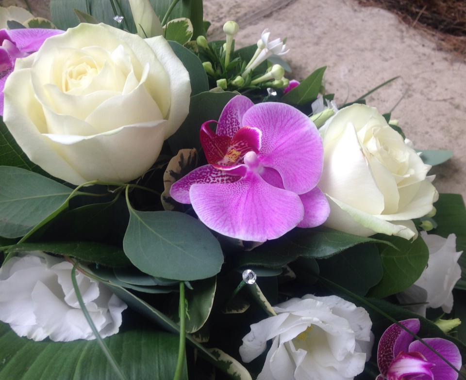 White double ended spray with striking pink phalaenopsis orchids going though the design of white roses and bouvardia.