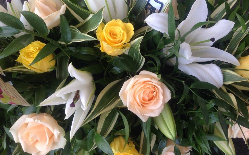 Peach and yellow casket spray, containing peach and yellow roses and white lillies. (1 meter in length)
