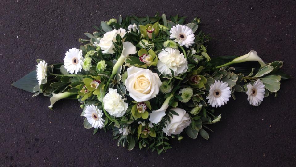 White double ended casket spray, modern design including white roses, white carnations, white gerbera’s, green orchids and white calla lilies. (24'' in length)