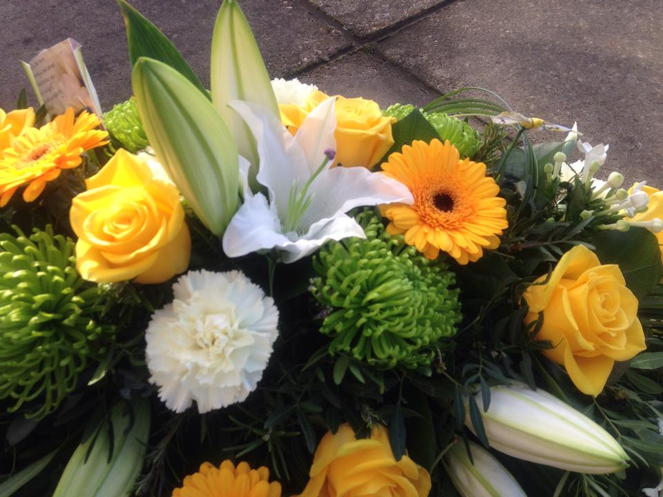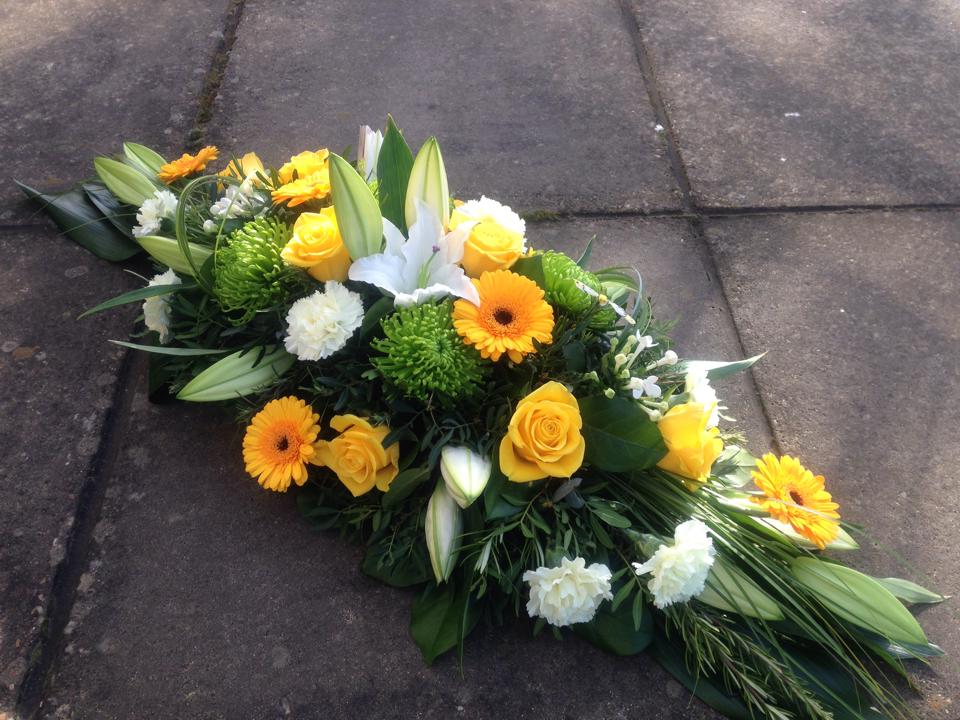 White and yellow casket spray, containing white lilies, yellow gerbera's, white bouvardia, white carnations and green chrysanthemums mixed with foliage's including rosemary. (39''in length)