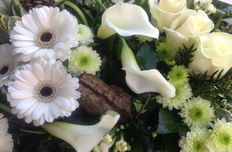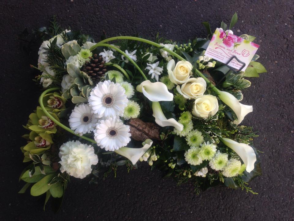 Natural textured Cushion containing a mixture of foliages with white roses, white gerberas, green orchids and white calla lilies which go though the design.
