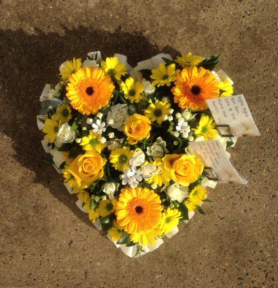 Loose heart shape design with a ribbon edge, containing gerberas, roses, spray roses, bouvardia and spray chrysanthemums, (12'' in size)