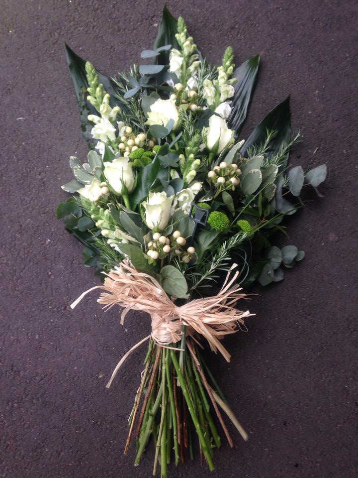 Natural White Tied Sheaf with white rose, white antirrhinums and Hypericum with mixed foliage's, finish with a raffia bow.