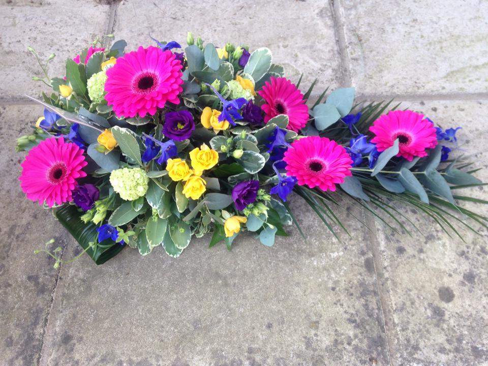 Vibrant Single Ended Spray with a mixture of bright colours, including pink gerberas, yellow spray roses, Blue delphinium and purple eustoma.