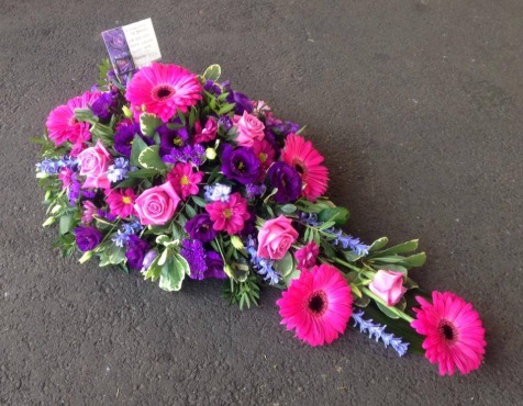 A vibrant pink and purple single ended spray containing pink gerberas, pink roses and chrysanthemums, purple eustoma and piped hyacinths.