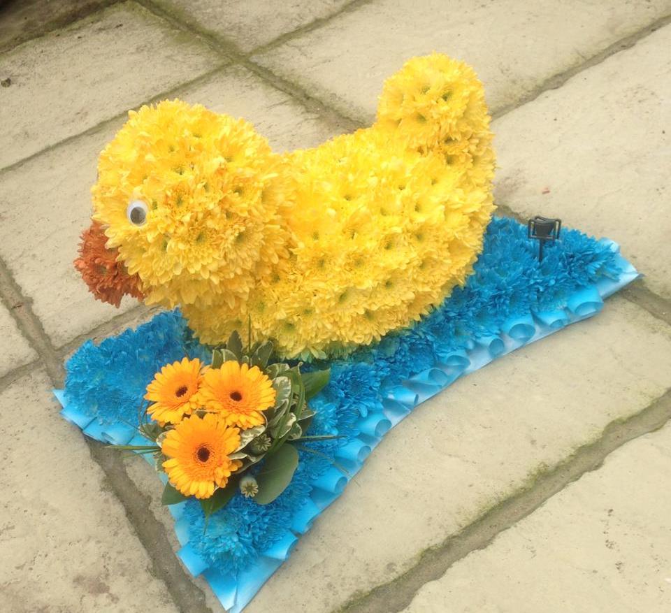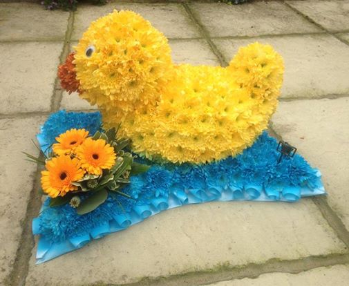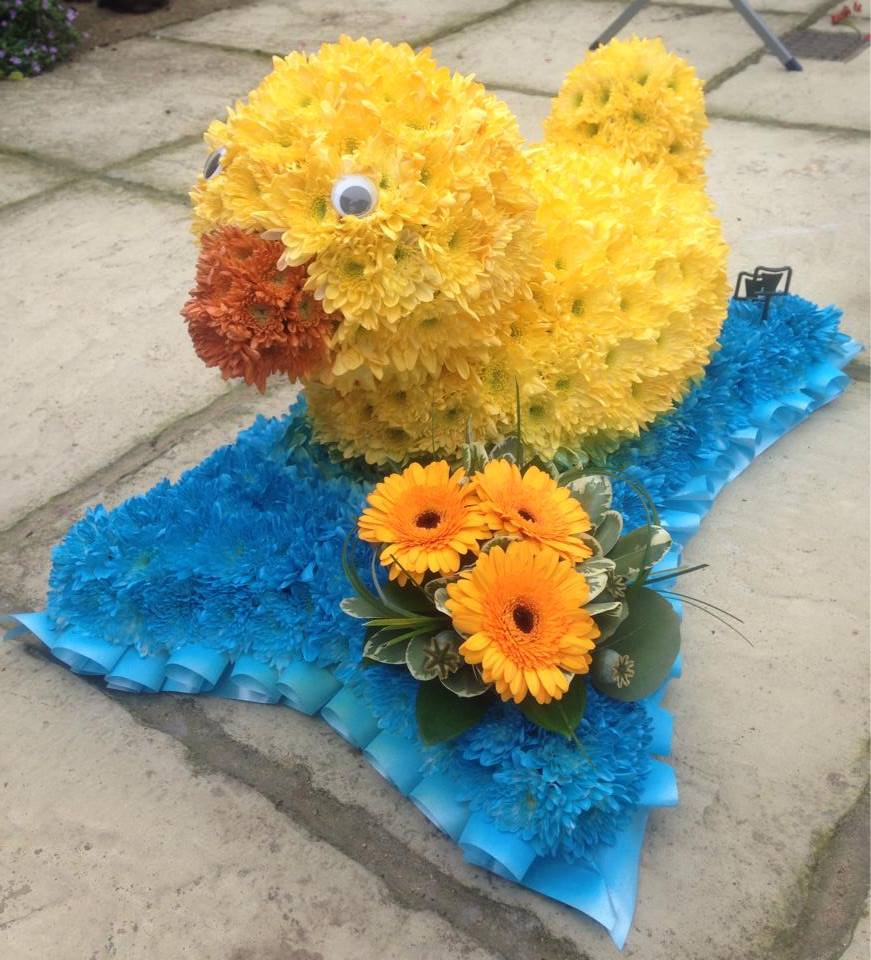 3D duck funeral tribute based in chrysanthemums placed on a based cushion frame. Finished with a gerbera arrangement.