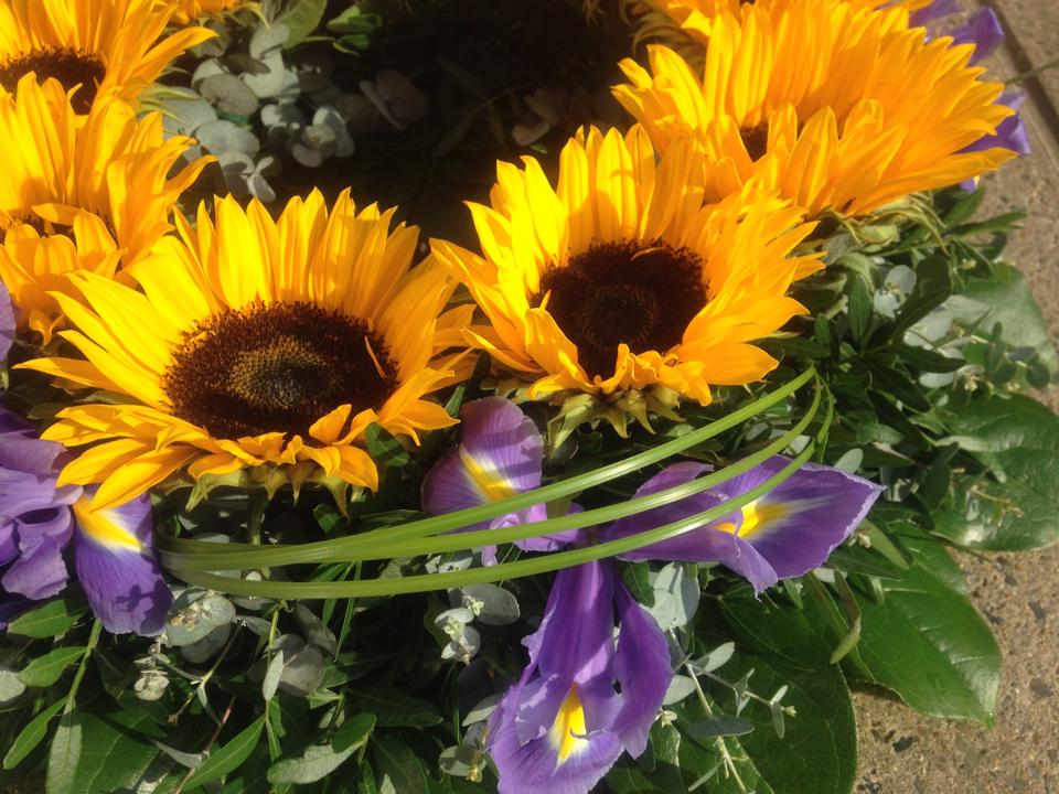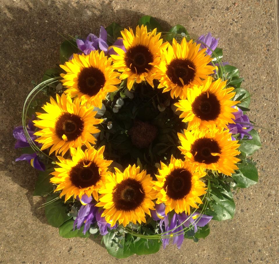 An all round funeral wreath edged with foliage and based in Sunflowers (12'' in size)
