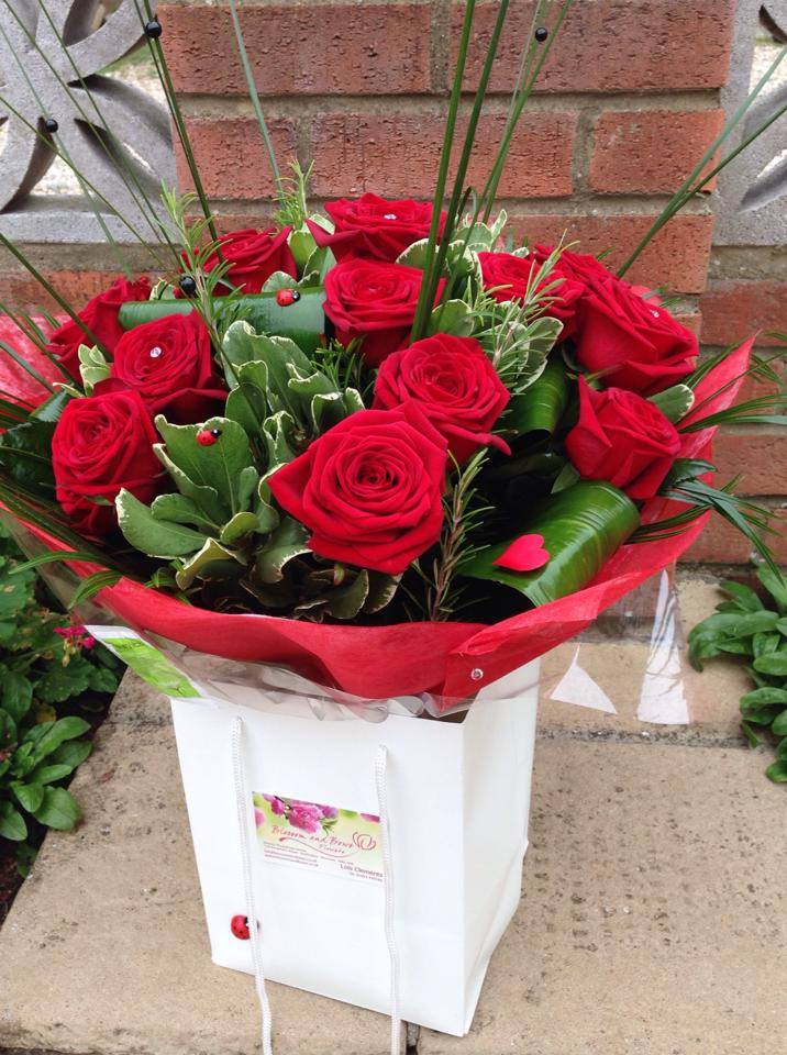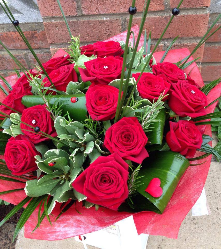 21 red rose hand tied with tall grasses finished off with beads and diamante's. Perfect gift for a loved one.