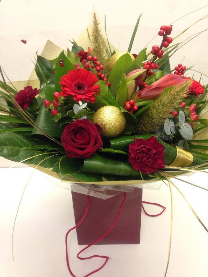 Festive red hand tied design, containing red roses, amaryllis, carnations, illex berries and gerberas.