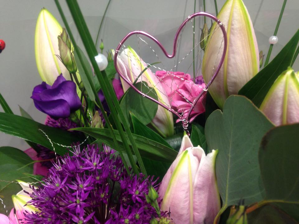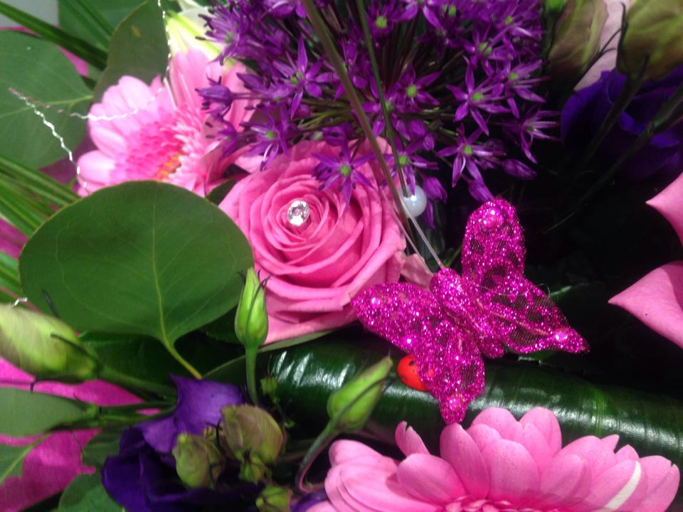 Modern style hand tied containing pink and purple flowers including roses, lilies and gerberas with tall grasses coming out of the design.