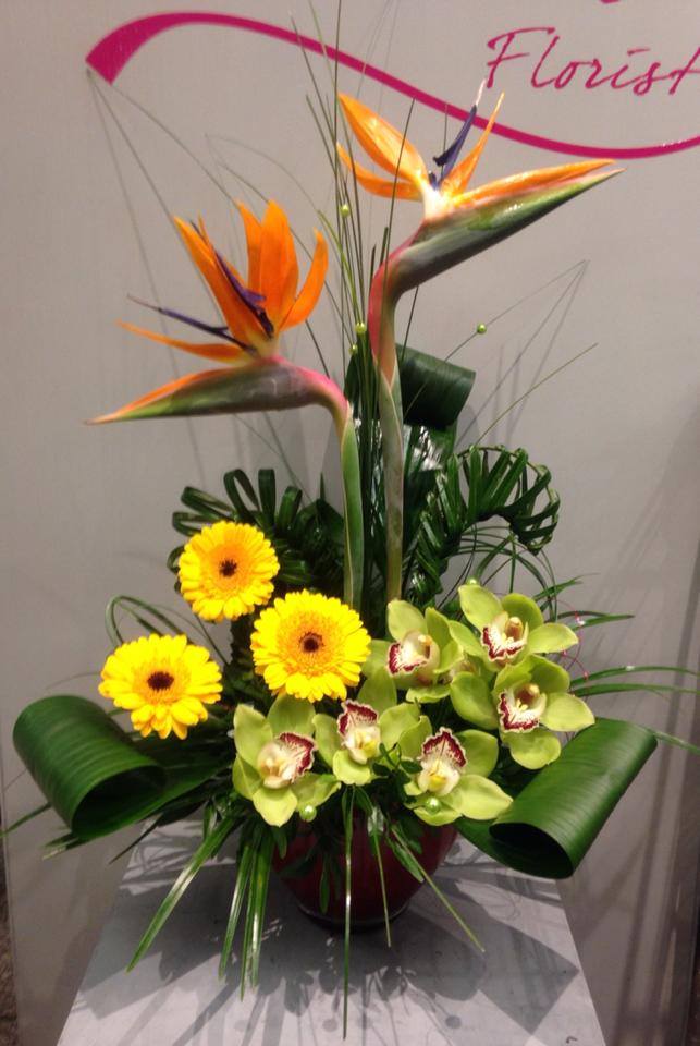 Tropical container arrangement with green orchids, Birds of paradise and gerbera’s finished with plated palms and beads in a red vase.