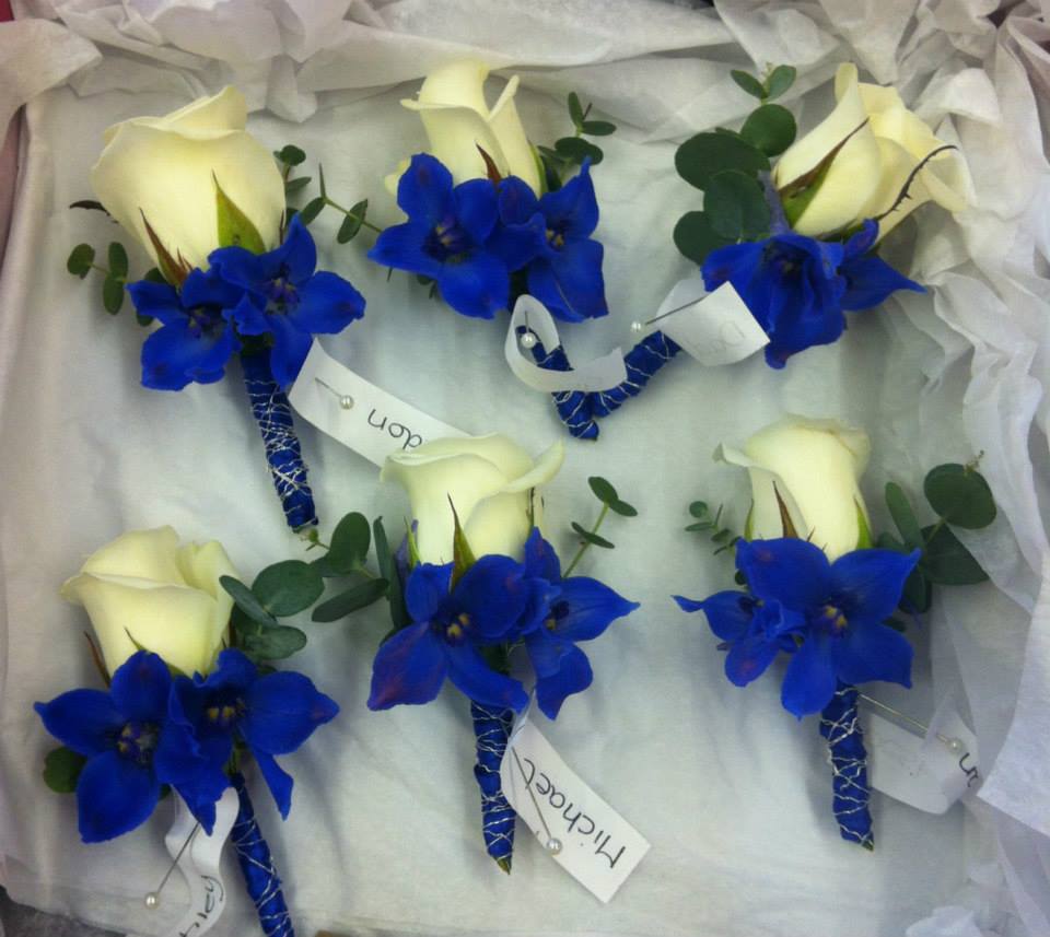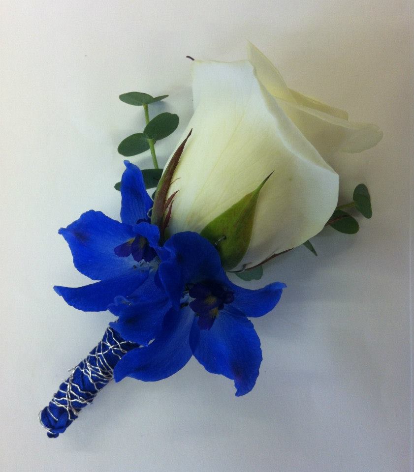 Royal Blue buttonhole, white rose with blue delphinium and eucalyptus foliage, finished with ribbon and wire.